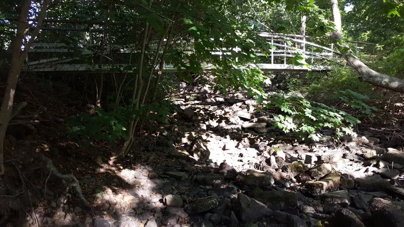 In one of our more thrilling moments of that year, the crane from Keeley Crane elevated the bridge span over tall trees and placed it gently on prepared bridge landings. The bridge provides a better view of the braided channel that flows toward Trout Brook's important springs. The bridge as well as a new southern trail are open for use.